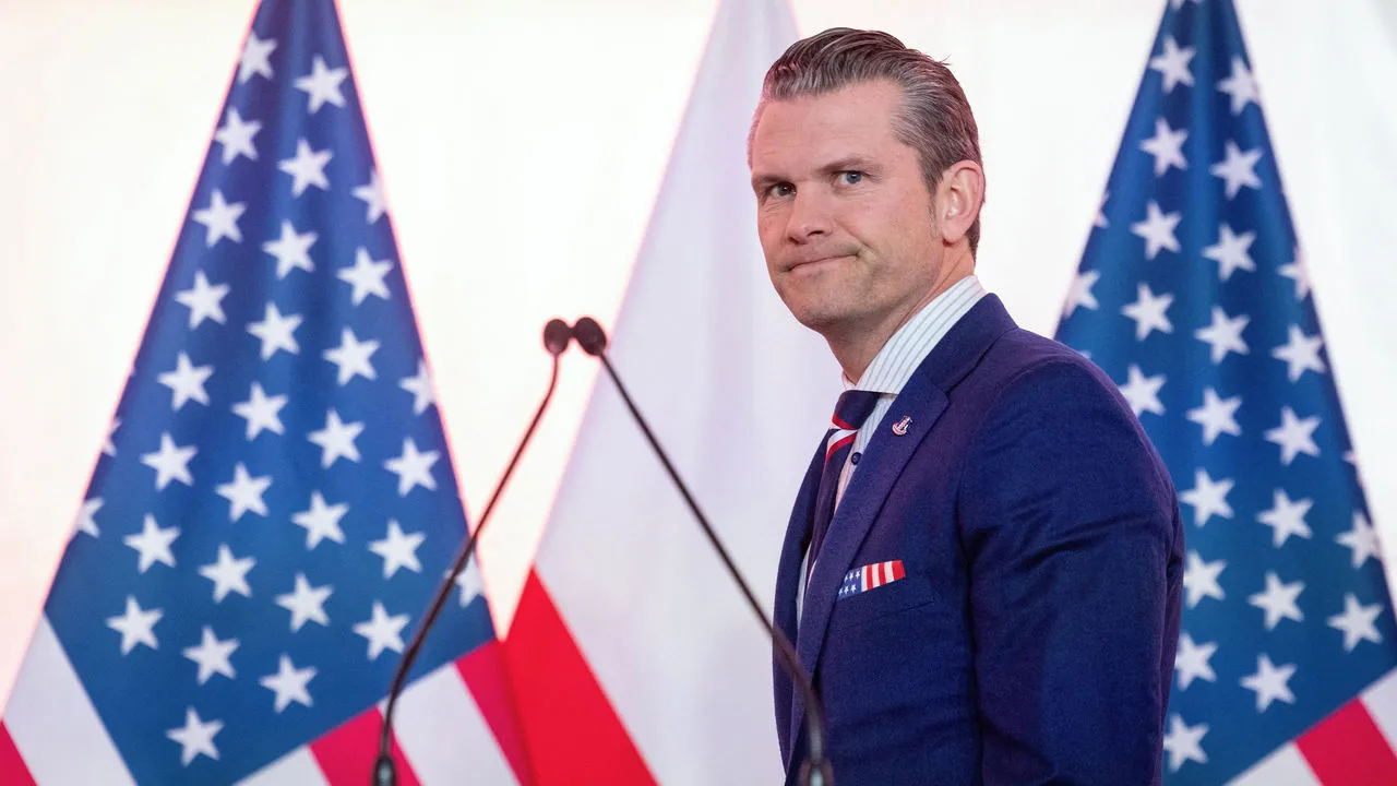 پیت هگست، وزیر دفاع آمریکا، برای یک کنفرانس مطبوعاتی وارد میشود — پرچمهای آمریکا در پسزمینه و دستمال جیبی او نیز با پرچم آمریکا تزئین شده است. (عکس: گتی ایمیجز)