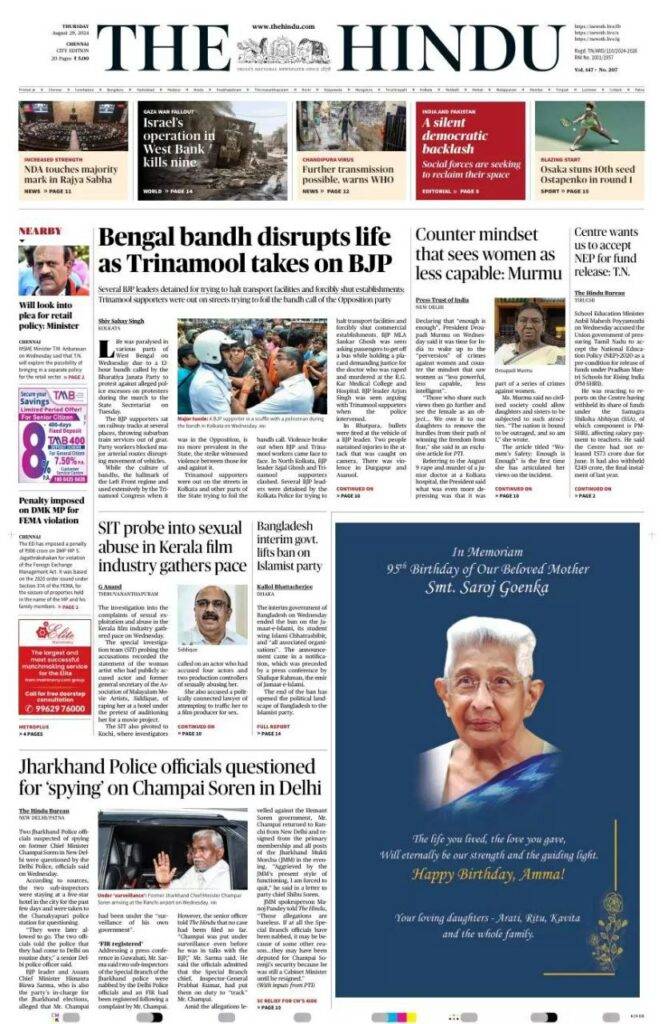 📌 سایر خبرها: تحقیقات SIT درباره سوءاستفاده جنسی در صنعت فیلم کرالا سرعت می‌گیرد، دولت موقت بنگلادش ممنوعیت حزب اسلامی را لغو می‌کند، و مقامات پلیس جارکند برای “جاسوسی” از چمپای سورن در دهلی مورد بازجویی قرار گرفتند.