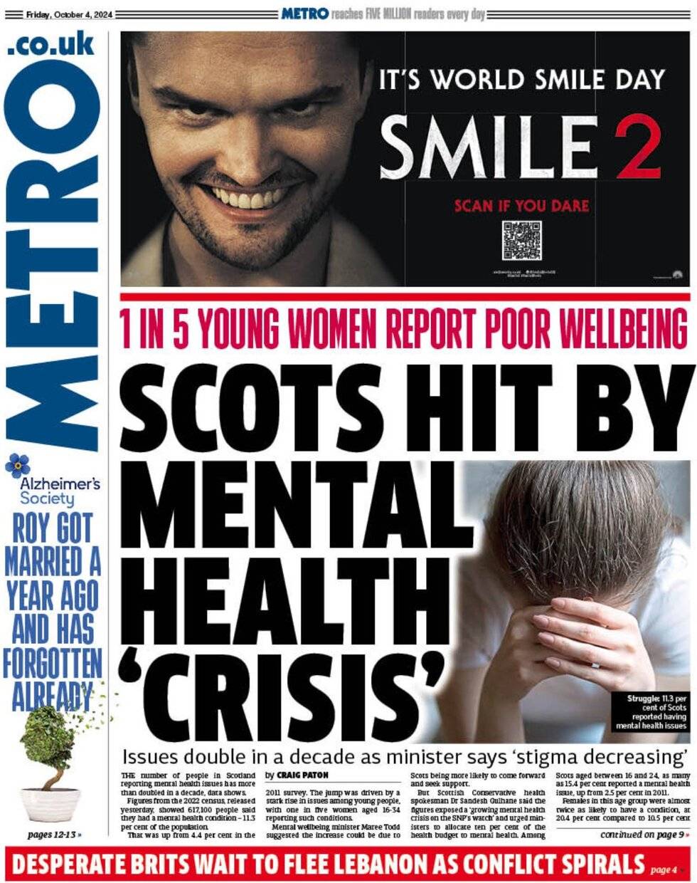 از هر ۵ زن جوان، ۱ نفر از وضعیت بد سلامتی گزارش می‌دهد. تعداد افراد مبتلا به مشکلات سلامت روان در اسکاتلند در یک دهه دو برابر شده است.