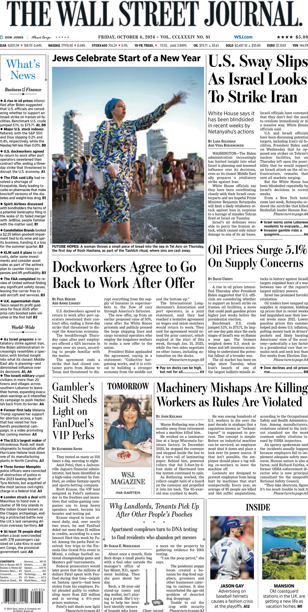 یهودیان آغاز سال نو را جشن میگیرند. تصویری از زنی که نان را به دریا میاندازد، به عنوان بخشی از مراسم تشلیخ در اولین روز روش هشانا نشان داده شده است.