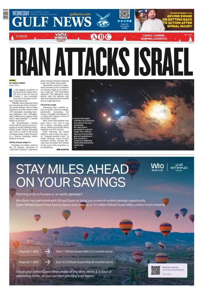 روزنامه گزارش میدهد که اسرائیل در مقابل حمله ۱۸۰ موشک بالستیک ایران به پناهگاه رفته است. ارتش اسرائیل اعلام کرده که به این حمله در سراسر خاورمیانه پاسخ خواهد داد.