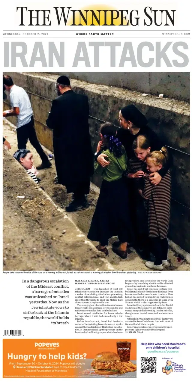 روزنامه گزارش میدهد که ایران حداقل ۱۸۰ موشک به سمت اسرائیل شلیک کرده است. این حمله تنشها بین اسرائیل و ایران را افزایش داده و نگرانیها از یک جنگ منطقهای گستردهتر را برانگیخته است. اتاوا خواستار آتشبس برای جلوگیری از تشدید بیشتر شده و از کاناداییهای مقیم لبنان خواسته تا این کشور را ترک کنند.