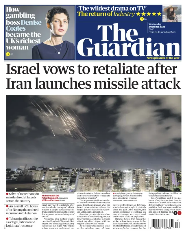 روزنامه گزارش میدهد که ایران حمله “وحشیانهای” با بیش از ۱۸۰ موشک به سمت اسرائیل انجام داده است. این حمله خسارات نسبتاً کمی به بار آورده، اما نگرانیها از تلافی اسرائیل را افزایش داده است.