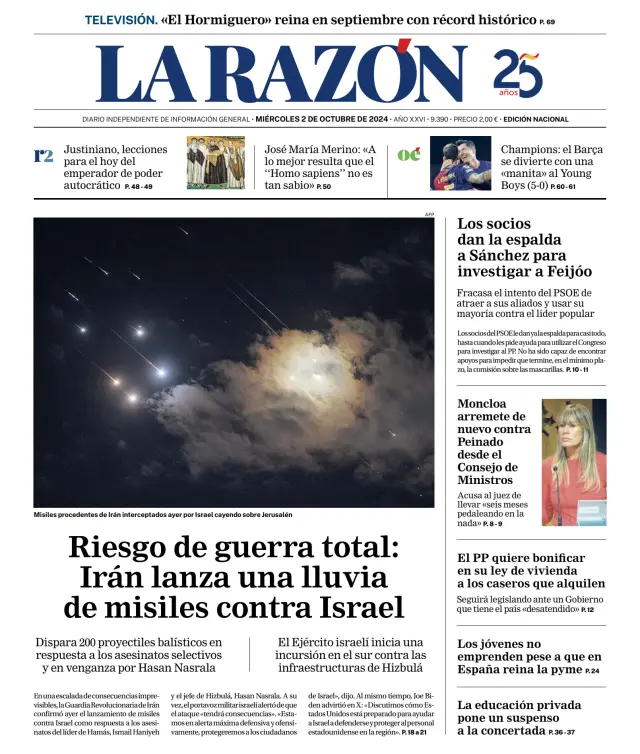 روزنامه اسپانیایی گزارش میدهد که ایران با حمله موشکی گسترده به شهرهای اسرائیل، جنگی منطقهای را آغاز کرده است. این حمله در پاسخ به حملات اسرائیل به لبنان صورت گرفته و هفت کشته برجای گذاشته است. نتانیاهو از حمایت آمریکا برای پاسخ به این حمله برخوردار شده است.