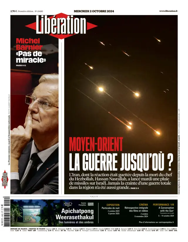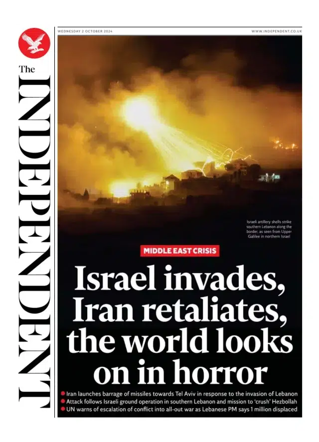 روزنامه گزارش میدهد که ایران در پاسخ به حمله اسرائیل به لبنان، بارانی از موشک به سمت تلآویو پرتاب کرده است. سازمان ملل متحد نسبت به گسترش درگیری به جنگ تمام عیار هشدار داده است. نخستوزیر لبنان اعلام کرده که یک میلیون نفر آواره شدهاند.